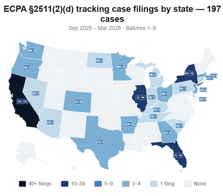 The geographic footprint is widening for tracking technology litigation. The lack of geographic constraints may also serve as an accelerant for ECPA cases. Because the ECPA is a Federal law, an ECPA lawsuit can be filed in any state and is not limited to the 12 states that have all-party consent wiretapping laws. While California filings still dominate because plaintiffs often allege both CIPA and ECPA claims, class action lawyers in other states are becoming more active.