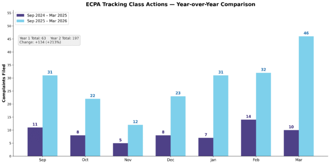 We have been systematically using AI to track new ECPA complaints since the ECPA Privacy Policy Orderto better understand the scope and direction of the ECPA litigation wave. Our analysis of 197 ECPA complaints filed between September 2025 and March 2026 reveals several important patterns regarding privacy disclosure-based ECPA lawsuits. First, the volume and consistency of number of lawsuits alleging ECPA claims has grown significantly between September 2025 and March 2026: doubling, tripling, and in some months even quadrupling the number of ECPA complaints filed in those same months last year: